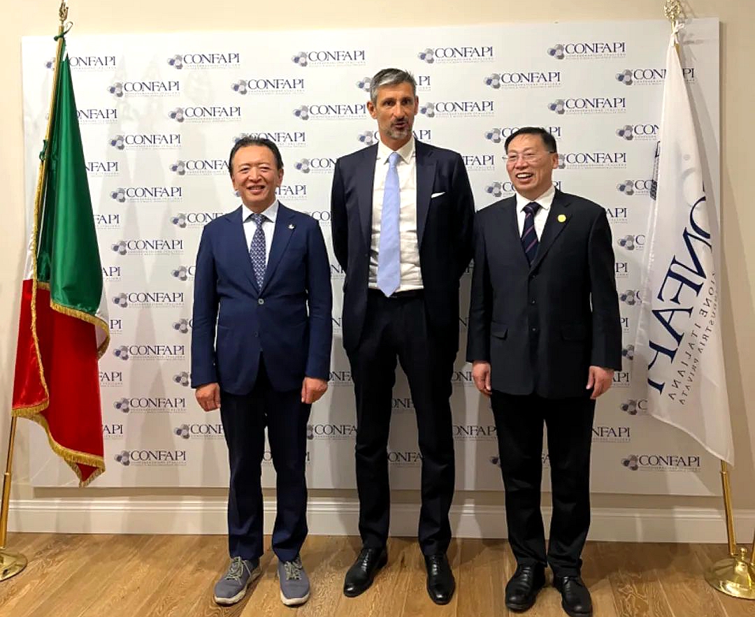 意大利中小企业联合会主席卡米萨与中国贸促会人事部部长徐宝林(右)及中国贸促会驻意大利代表处总代表姚鲁杰(左)亲切合影