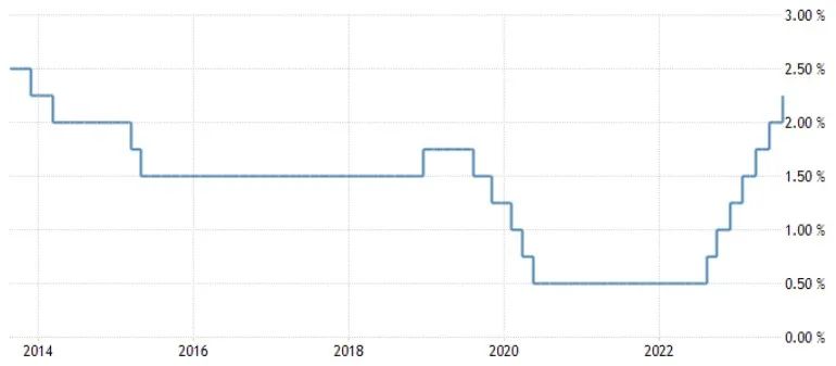 数据显示,2023年6月泰国通货膨胀率降至22个月以来的最低水平0.23%,反映了通胀压力已明显减弱,虽然其中也有上年基数较高的因素。预期下半年泰国经济增速在旅游业强劲复苏的拉动下将高于上半年,进而推升国内需求。同时,严重的厄尔尼诺现象和国际地缘政治紧张局势将导致大宗商品价格走势波动并趋向上升。此外,生产商将增加的成本传递给消费者的过程仍未完全结束,加上去年下半年的比较基数下降。因此,下半年泰国通货膨胀率将从5-6月接近于零的水平有所回升,促使泰国央行决定再次上调政策利率。